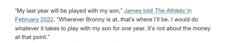2022年2月,詹姆斯在接受The Athletic采訪時第一次談到父子同臺的愿望:“我在生涯最后一年會和我兒子一起打球,無論布朗尼在哪里,我都會去那個地方。我愿意做任何事情來實現(xiàn)與我的兒子一起打球一年。屆時錢也就不重要了?!?/p>