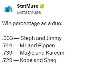 庫(kù)里+巴特勒勝率93.3%!美媒對(duì)比:?jiǎn)痰てづ?4.4% 科比鯊魚(yú)72.9%