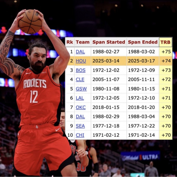 據(jù)統(tǒng)計(jì),火箭能在3場(chǎng)比賽區(qū)間里比對(duì)手多搶74個(gè)籃板,歷史第2多,僅次于1988年的獨(dú)行俠(75個(gè))。