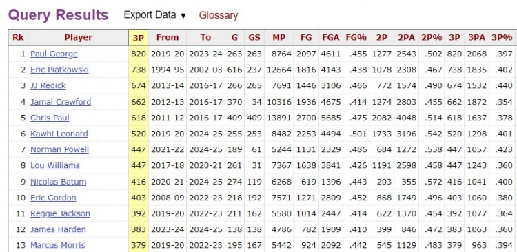 根據(jù)數(shù)據(jù)統(tǒng)計(jì),加上已經(jīng)投進(jìn)的1個(gè)三分,鮑威爾快船生涯三分?jǐn)?shù)來到448記,他超越路威,獨(dú)居隊(duì)史三分榜第7位。