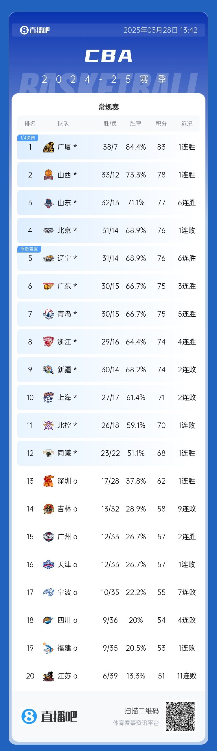 3月28日訊 本賽季常規(guī)賽第45輪昨晚已經(jīng)全部結(jié)束,本輪比賽過后,本賽季的排名形勢進(jìn)一步明朗。
