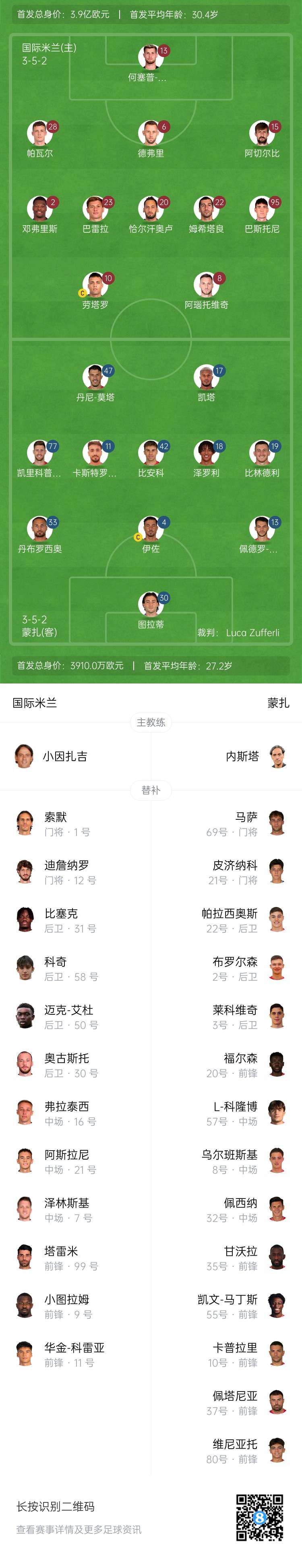 3月9日訊 意甲第28輪,國米主場迎戰(zhàn)蒙扎比賽即將打響。賽前首發(fā)出爐。