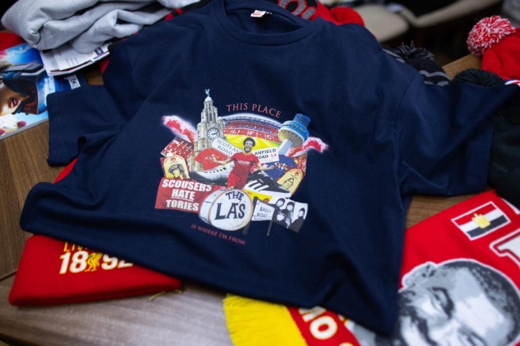 在距離利物浦主場(chǎng)安菲爾德只有5分鐘步行路程的一家商店里,你可以看到當(dāng)?shù)卣诔鍪垡患?0鎊的T恤,上面印有目前利物浦這座城市的標(biāo)志:樂隊(duì)披頭士和The La's、地標(biāo)性建筑皇家利物大廈和利物浦電臺(tái)城塔,以及薩拉赫。