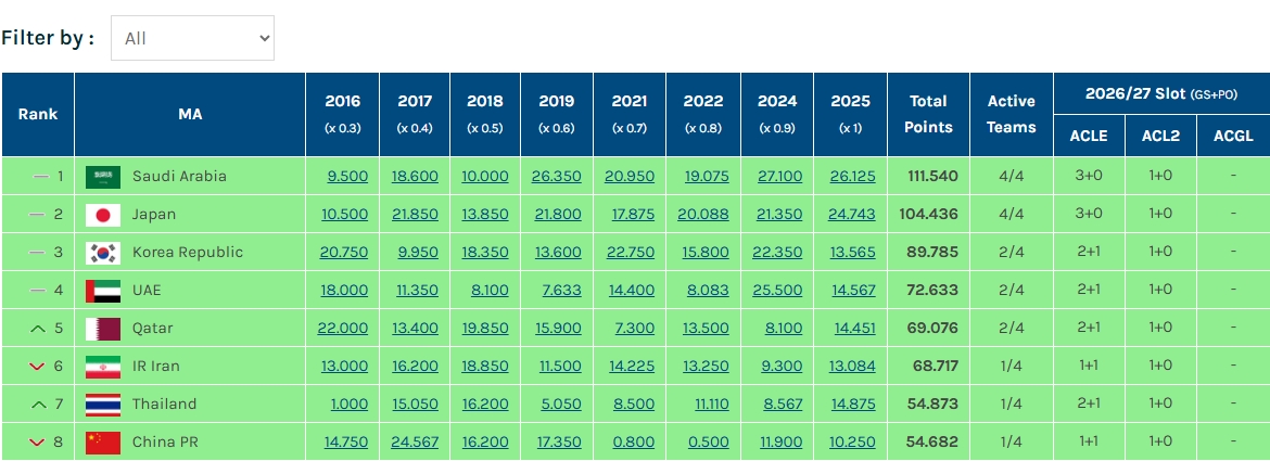 亞足聯(lián)俱樂部技術(shù)分東亞區(qū)第4,1+1個(gè)亞冠精英聯(lián)賽名額,1個(gè)亞冠2聯(lián)賽名額
