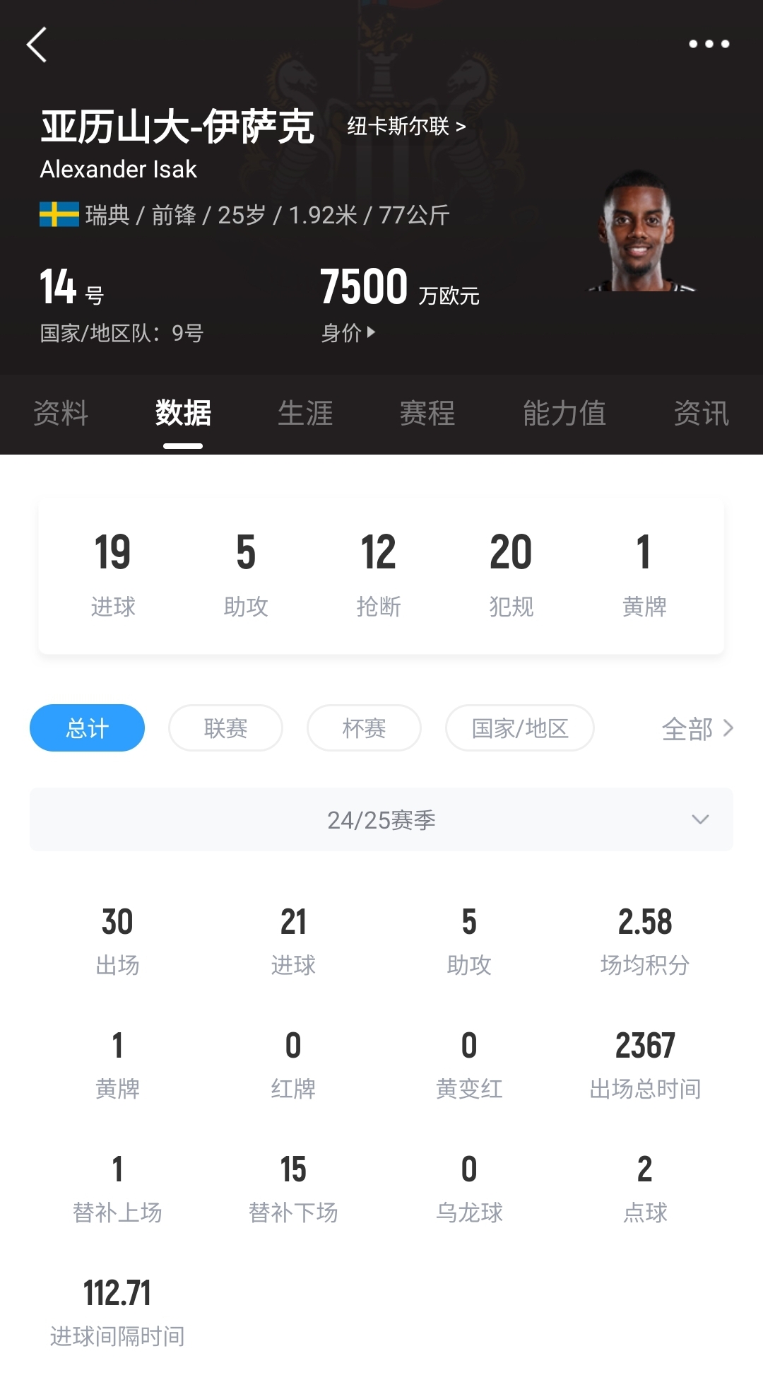 2022年夏窗紐卡花費7000萬歐簽下球員。本賽季25歲的伊薩克為紐卡出戰(zhàn)30場比賽,打進21球并有5次助攻,目前球員德轉身價7500萬歐。