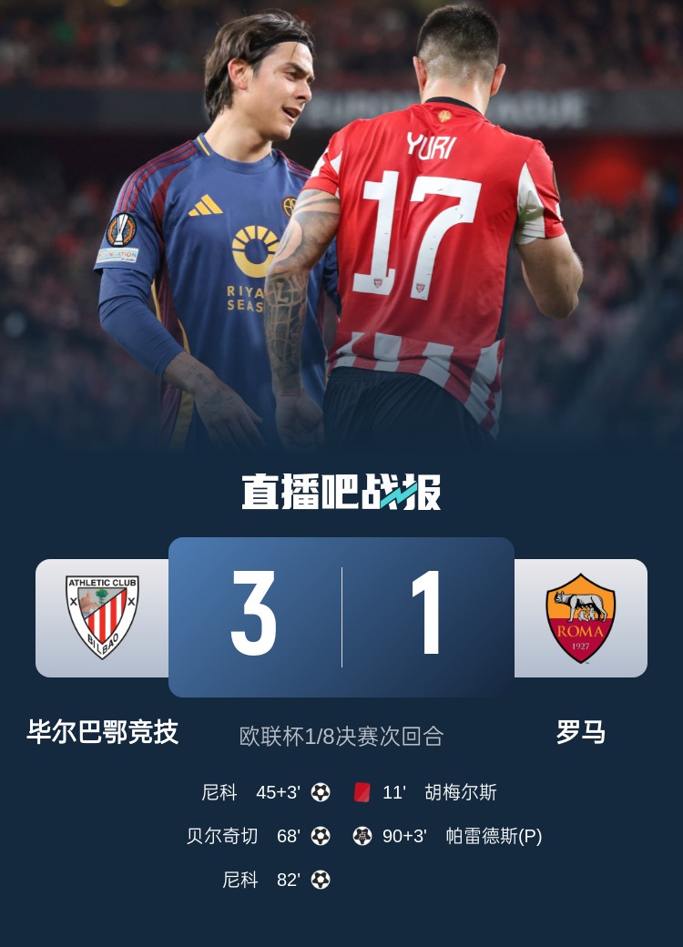 無緣八強(qiáng)!十人羅馬1-3總比分3-4遭畢巴逆轉(zhuǎn) 胡梅爾斯11分鐘直紅