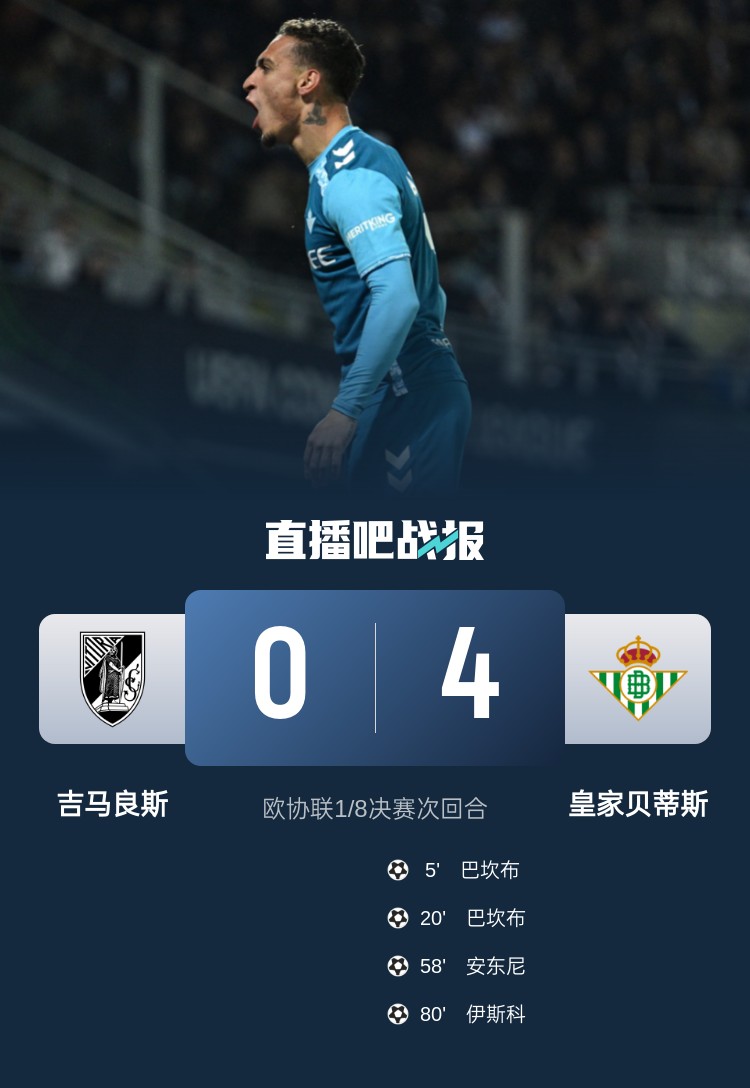 貝蒂斯4-0總比分6-2擊敗吉馬良斯,安東尼傳射+策動兩球!貝蒂斯晉級歐協(xié)聯(lián)8強(qiáng)!