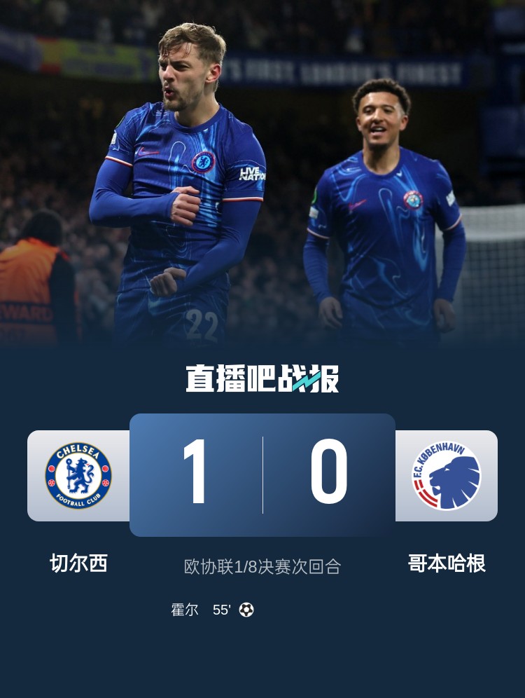 切爾西1-0總比分3-1哥本哈根,晉級歐協(xié)聯(lián)8強(qiáng)階段。