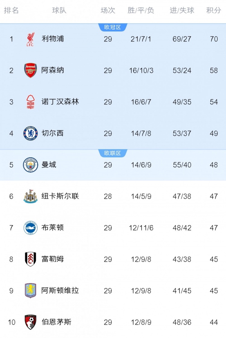 英超積分榜前十: