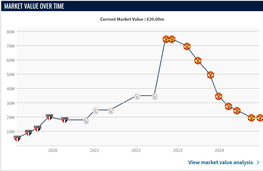 本賽季25歲的安東尼自曼聯(lián)租借至皇家貝蒂斯后狀態(tài)火熱,為皇家貝蒂斯出場11場已打入4球,并有4次助攻,且多為關鍵進球,幫助皇家貝蒂斯近期斬獲西甲五連勝??伤纳韮r卻與去年12月份相同,仍為2000萬歐元。