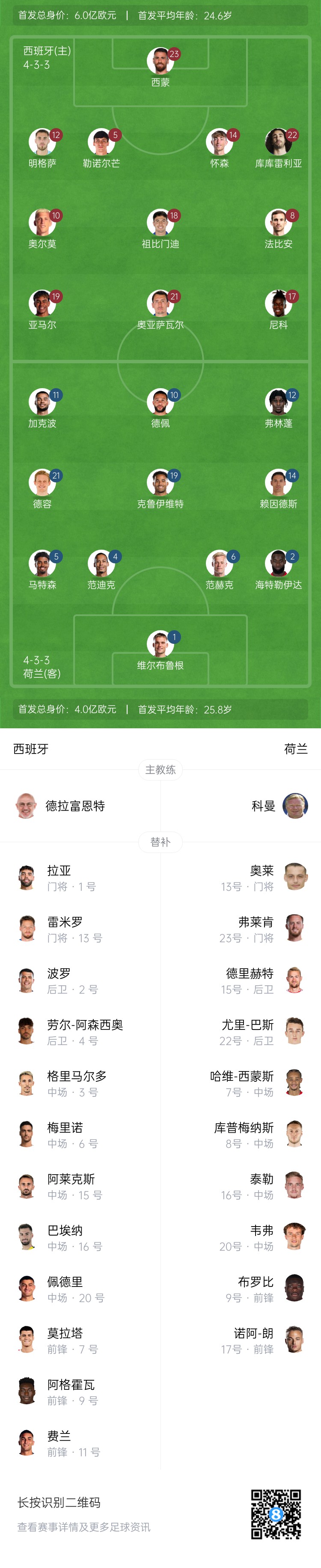 西班牙首發(fā):23-烏奈-西蒙、12-明格薩、5-勒諾爾芒、14-懷森、22-庫庫雷利亞、18-祖比門迪、8-法比安、10-奧爾莫、19-亞馬爾、17-尼科-威廉姆斯、21-奧亞薩瓦爾