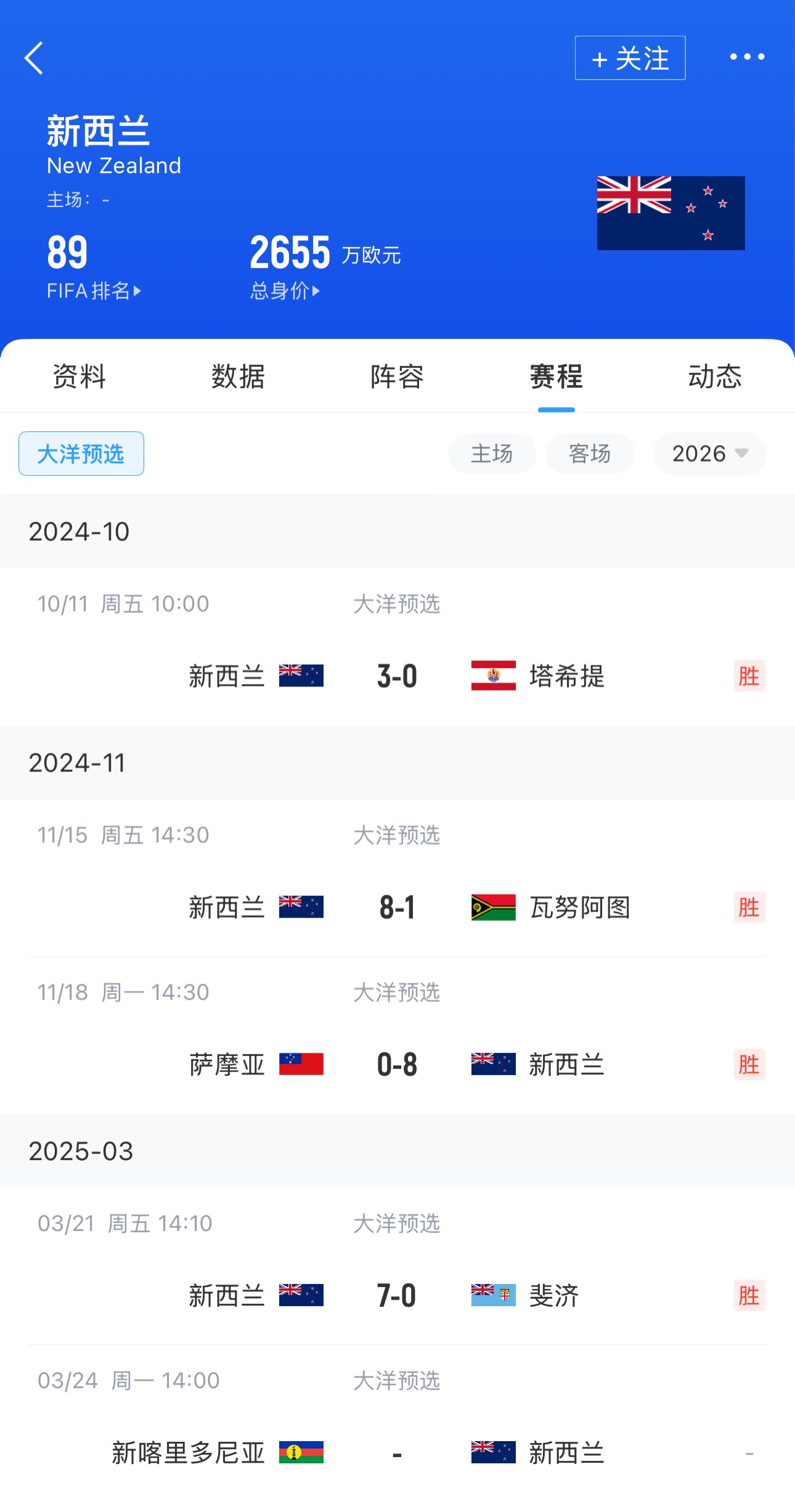 新西蘭FIFA排名第89,只比國足高1位,陣容身價(jià)2655萬歐,本屆預(yù)選賽至今4場打進(jìn)26球只丟1球。