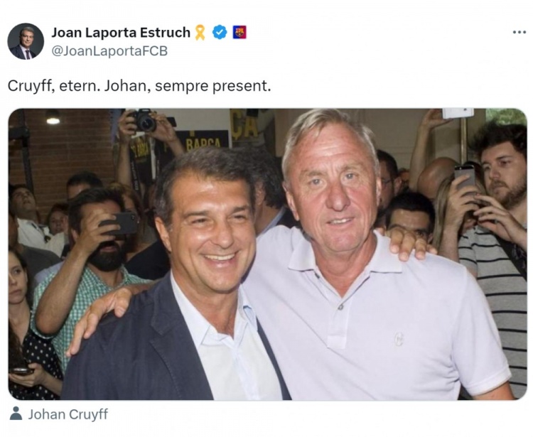克魯伊夫逝世九周年之際,拉波爾塔在社交媒體上曬出與這位俱樂(lè)部傳奇的合照,并配文:“克魯伊夫,永恒不朽;約翰,永伴我們?!?/p>
