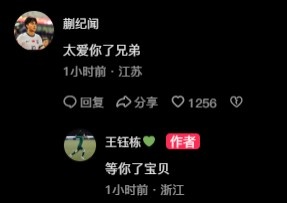 他在U20國足的隊友蒯紀聞留言“太愛你了兄弟”,王鈺棟則調(diào)侃回復(fù)“(國家隊)等你了寶貝”。