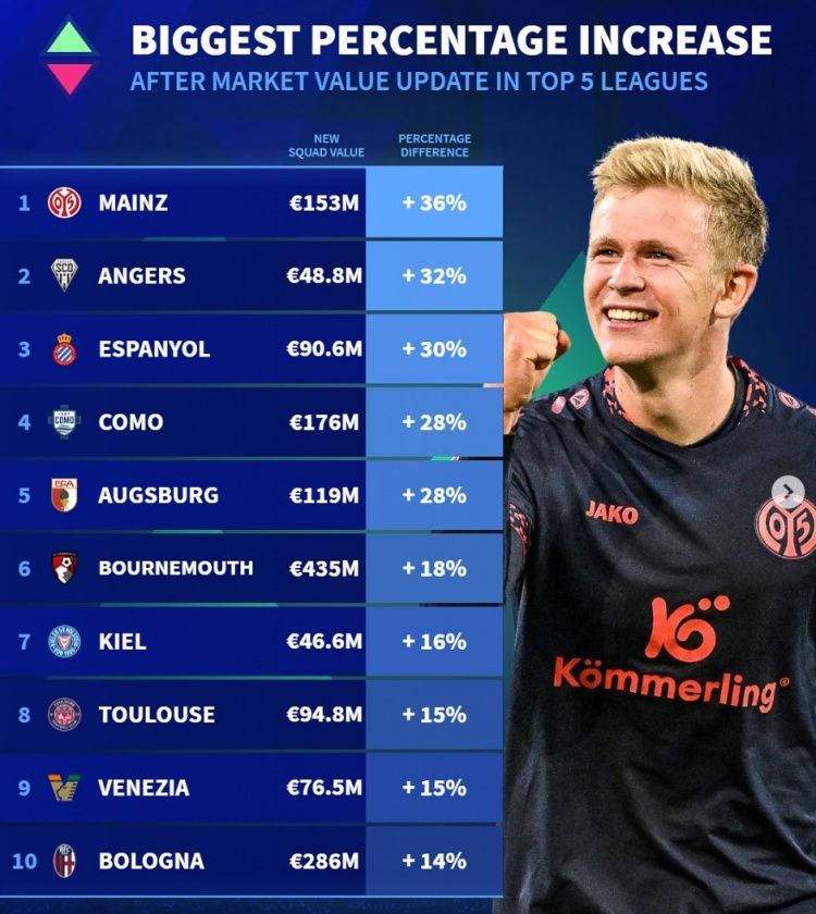 五大聯(lián)賽球隊(duì)身價升值比例:美因茨漲36%,博洛尼亞&伯恩茅斯在列