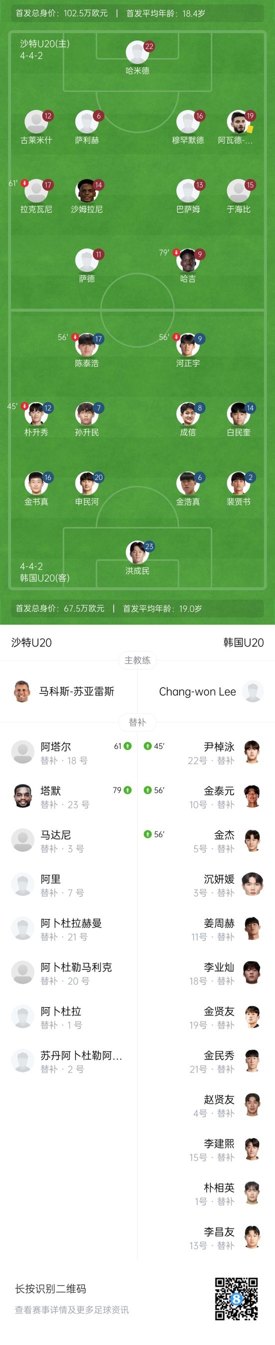 上半場(chǎng)補(bǔ)時(shí)1分鐘,U20沙特0-0韓國(guó)U20。