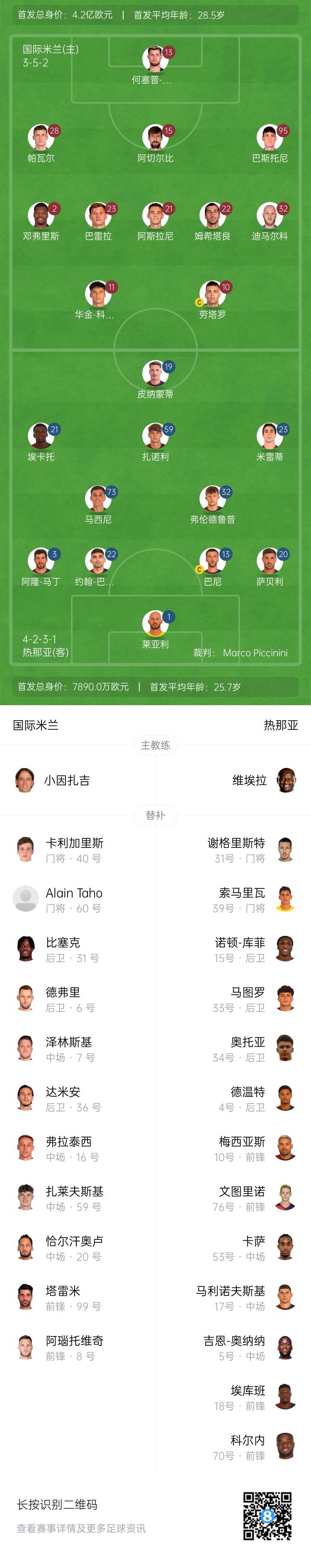 目前,國米在意甲16勝6平3負(fù)積54分,位居積分榜第2位;熱那亞在意甲7勝9平9負(fù)積30分,位居積分榜第11位。