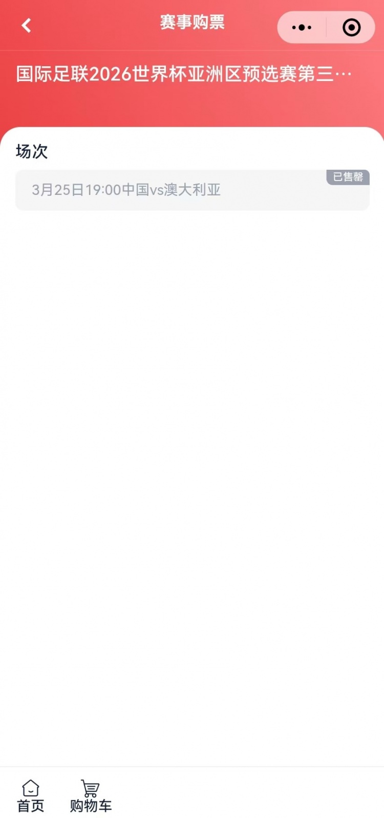 3月7日訊 國足將于3月25日于世預(yù)賽18強戰(zhàn)主場迎戰(zhàn)澳大利亞,本場球票在今日17點開售,多個平臺迅速售罄。