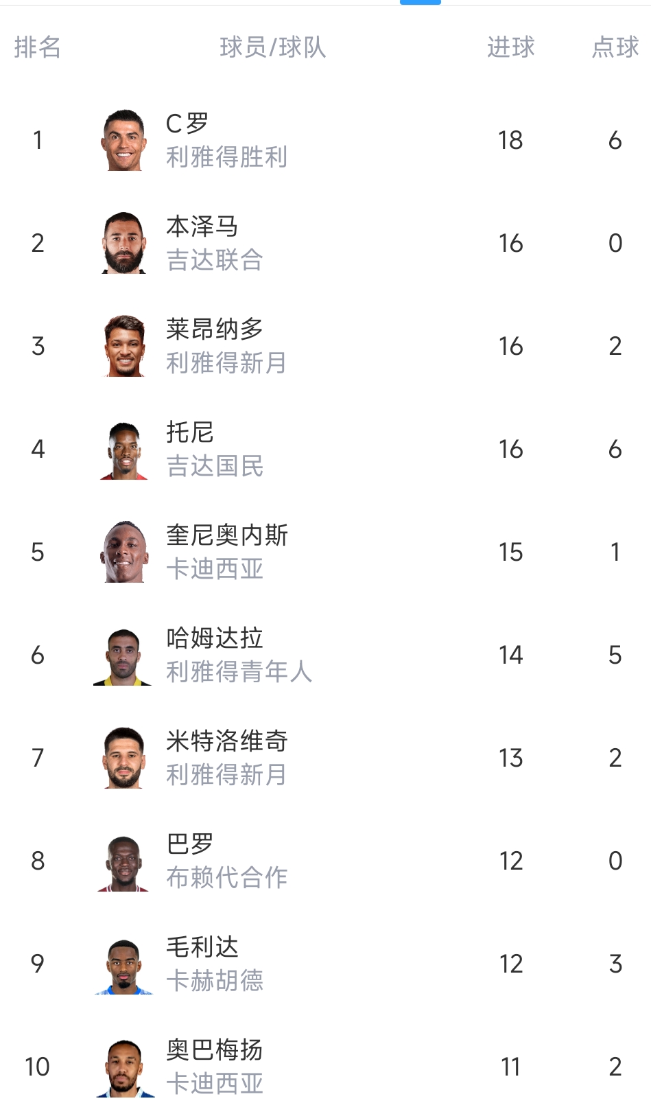 最新沙特聯(lián)射手榜,C羅18球領(lǐng)跑,本澤馬、萊昂納多、托尼16球并列第二,奧巴梅揚(yáng)11球第十。